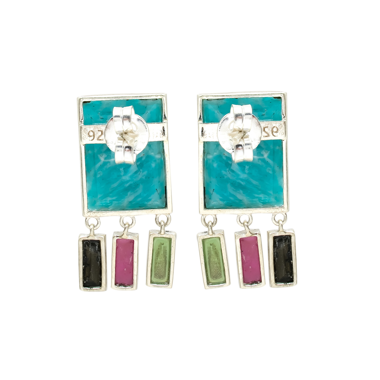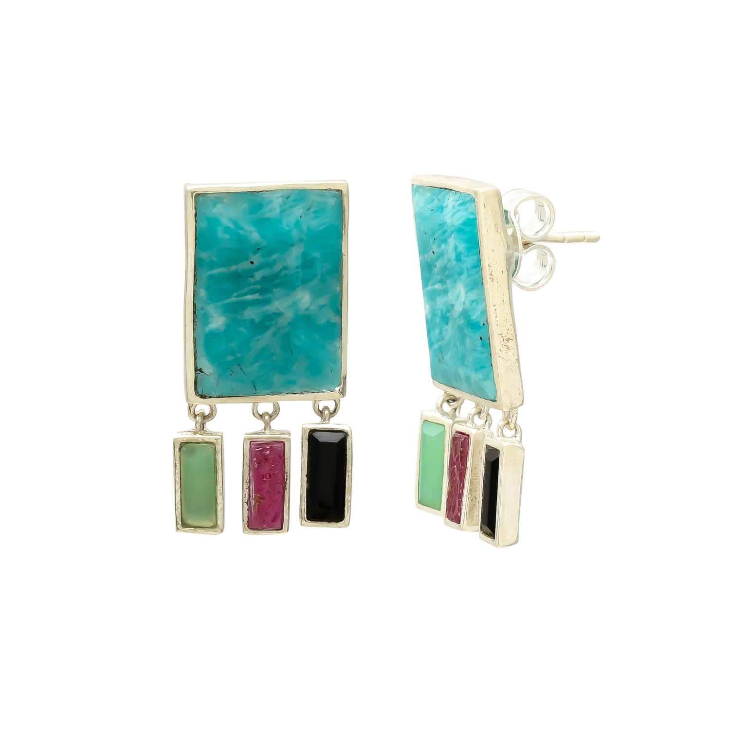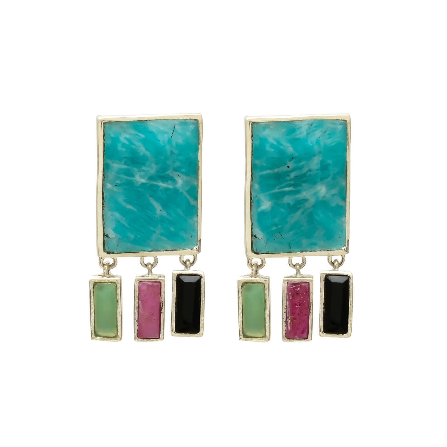 Bold, colorful, and full of personality—these handcrafted dangle earrings feature a striking rectangular amazonite centerpiece, paired with vibrant vertical bars of green aventurine, pink tourmaline, and black onyx. Set in a refined silver frame, each stone adds a unique pop of color and contrast. A statement piece that brings a contemporary twist to traditional gemstone jewelry, perfect for those who love to stand out with artistic flair.