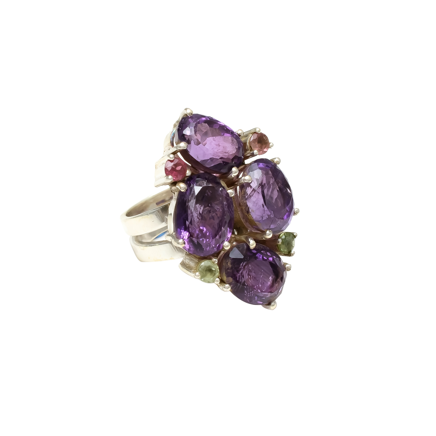 A bold expression of elegance, this captivating ring features a vibrant cluster of richly faceted amethysts accented with multicolored tourmalines. Perfect for adding a royal touch to any look
