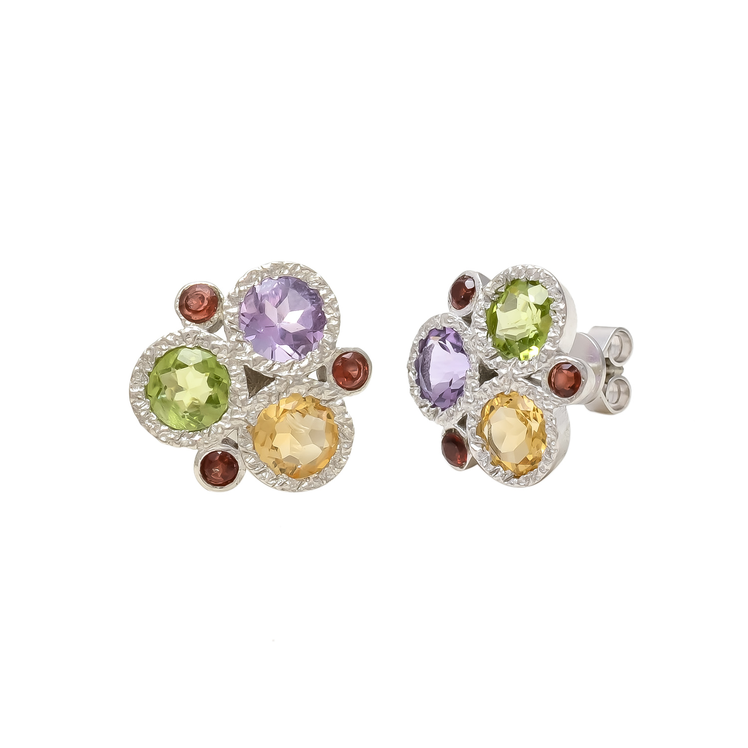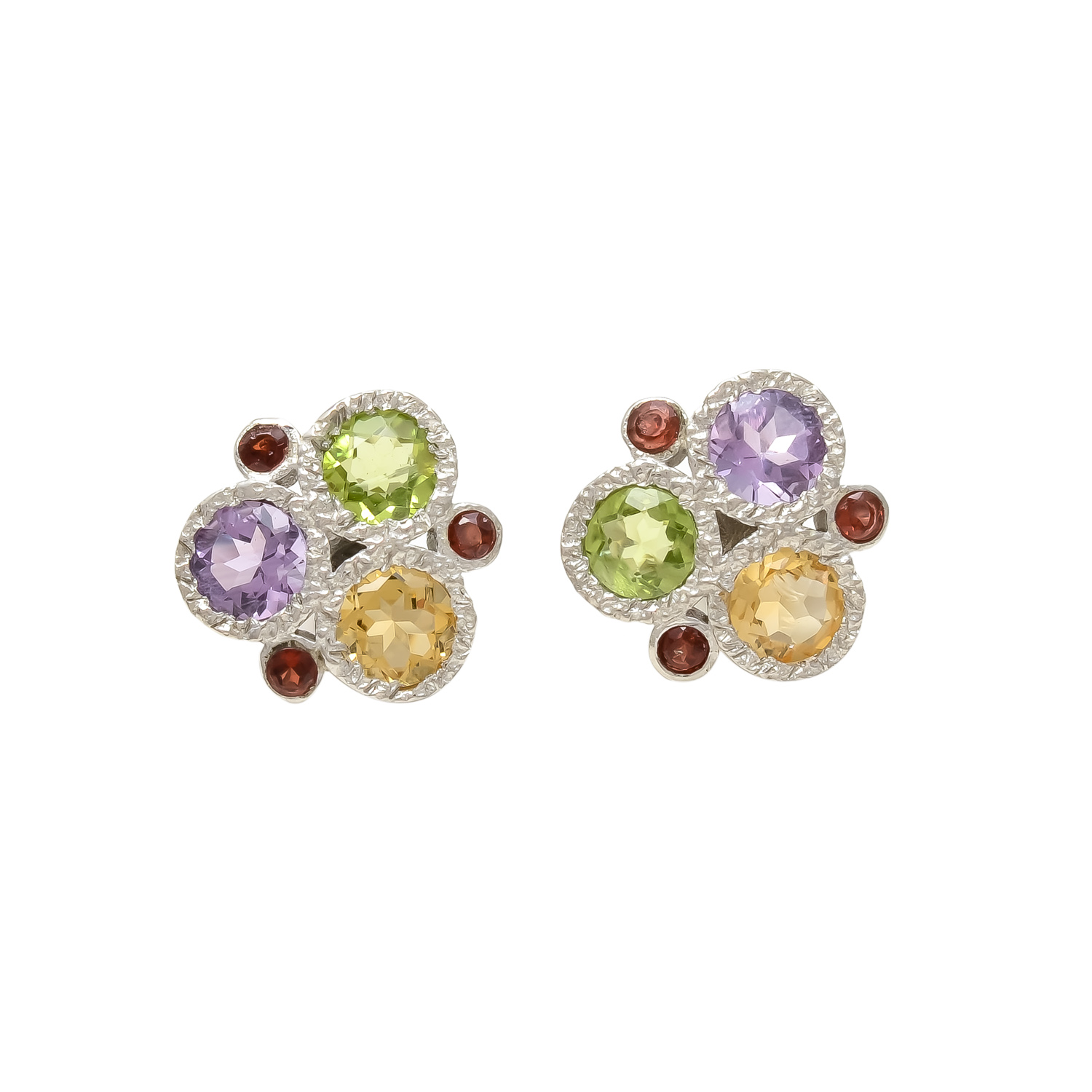 Brighten your style with these stunning silver cluster earrings, featuring a vibrant mix of amethyst, peridot, citrine, and garnet gemstones. Their lively colors and elegant design make them the perfect accessory to add sparkle and charm to both everyday wear and special occasions. Handcrafted for timeless beauty, these earrings celebrate the brilliance of nature’s finest gems.