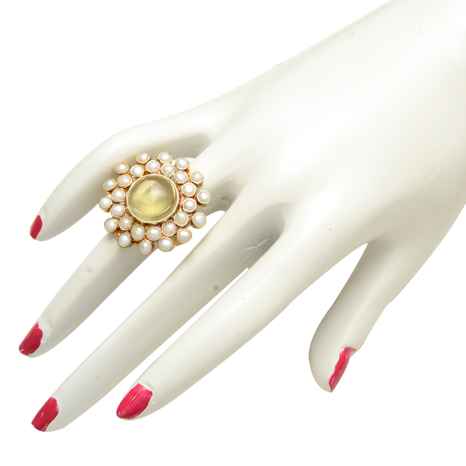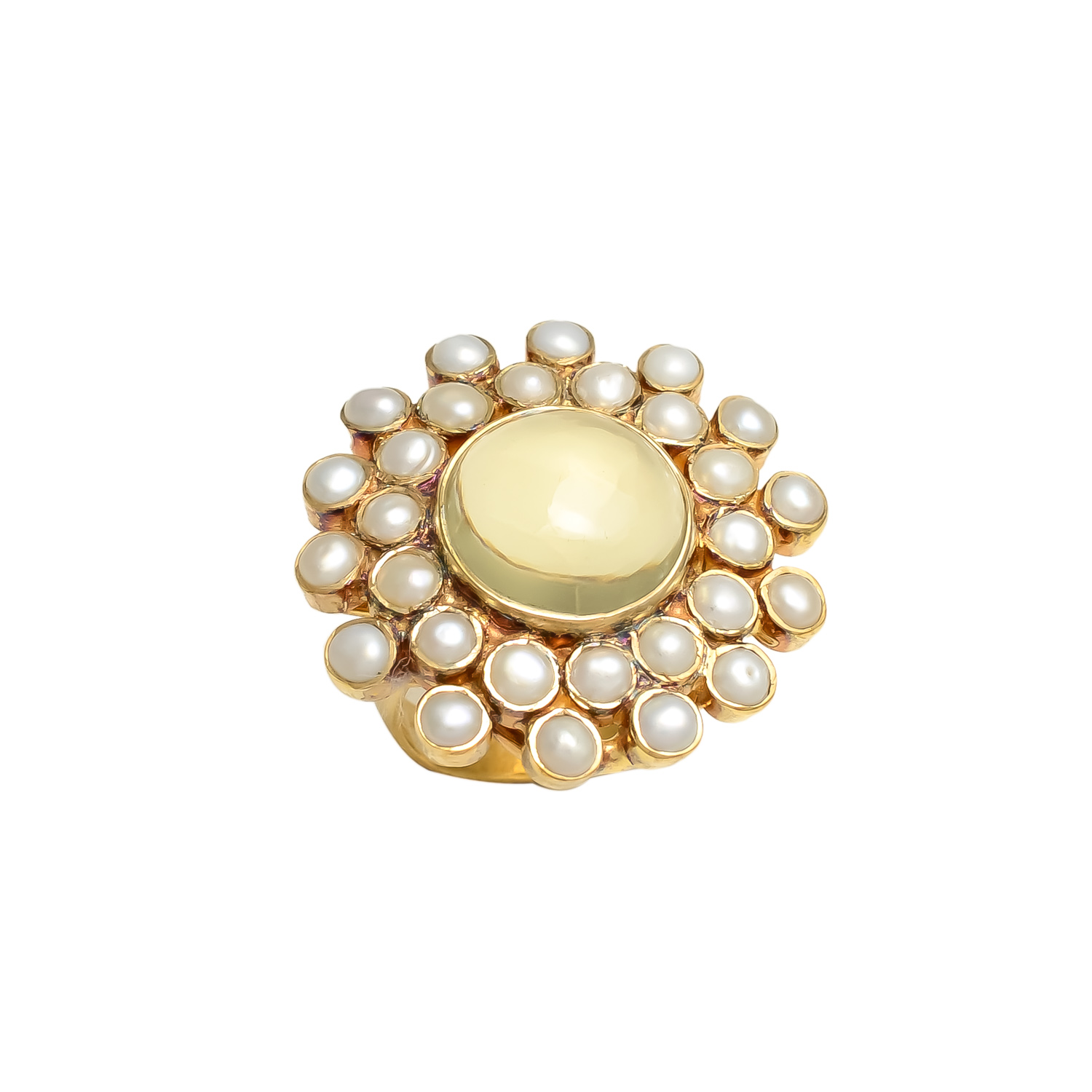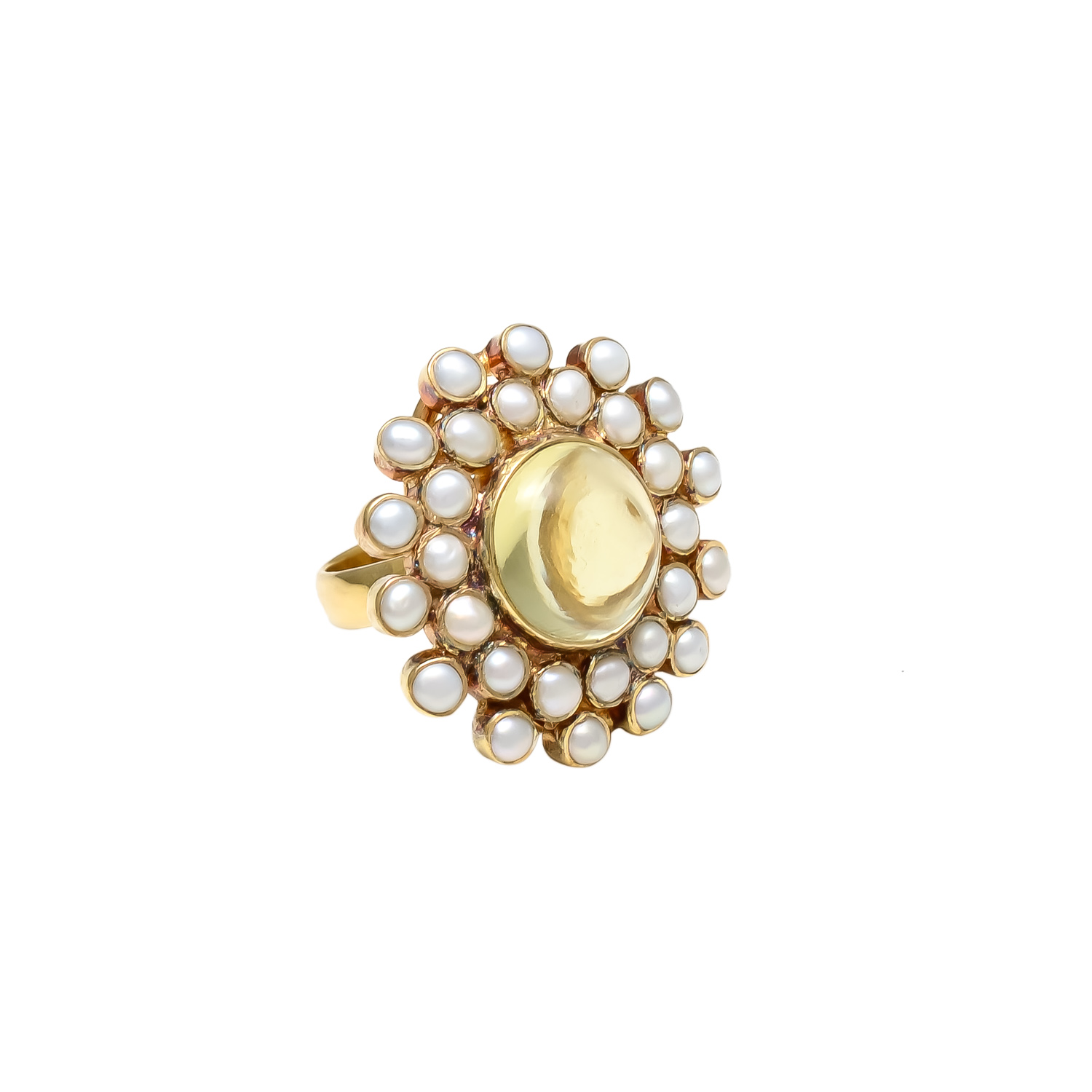 A graceful blend of beauty and charm, this ring features a soft yellow tourmaline surrounded by luminous pearls in a gold setting. Perfect for timeless elegance and refined style WT:- 10.3 gm (Tentative) Metal :- 925