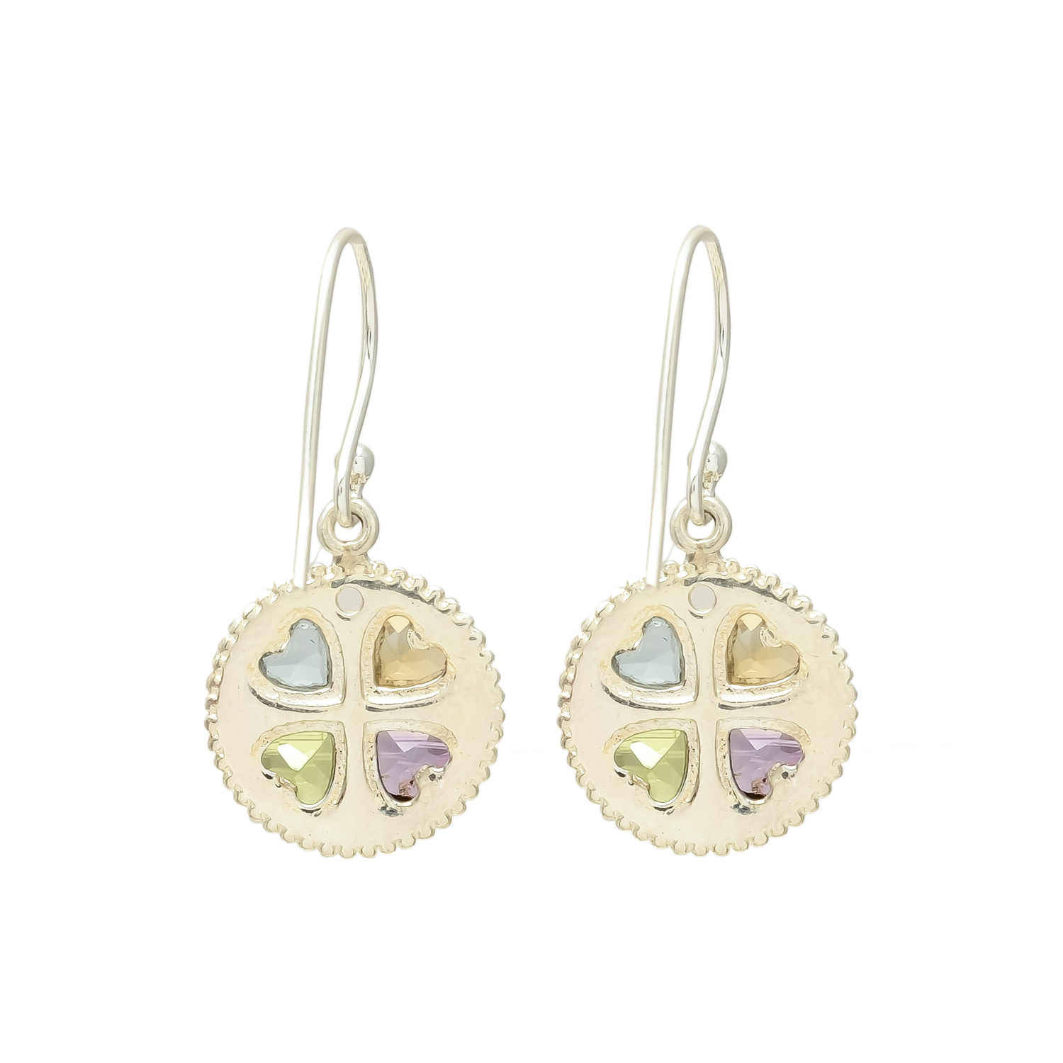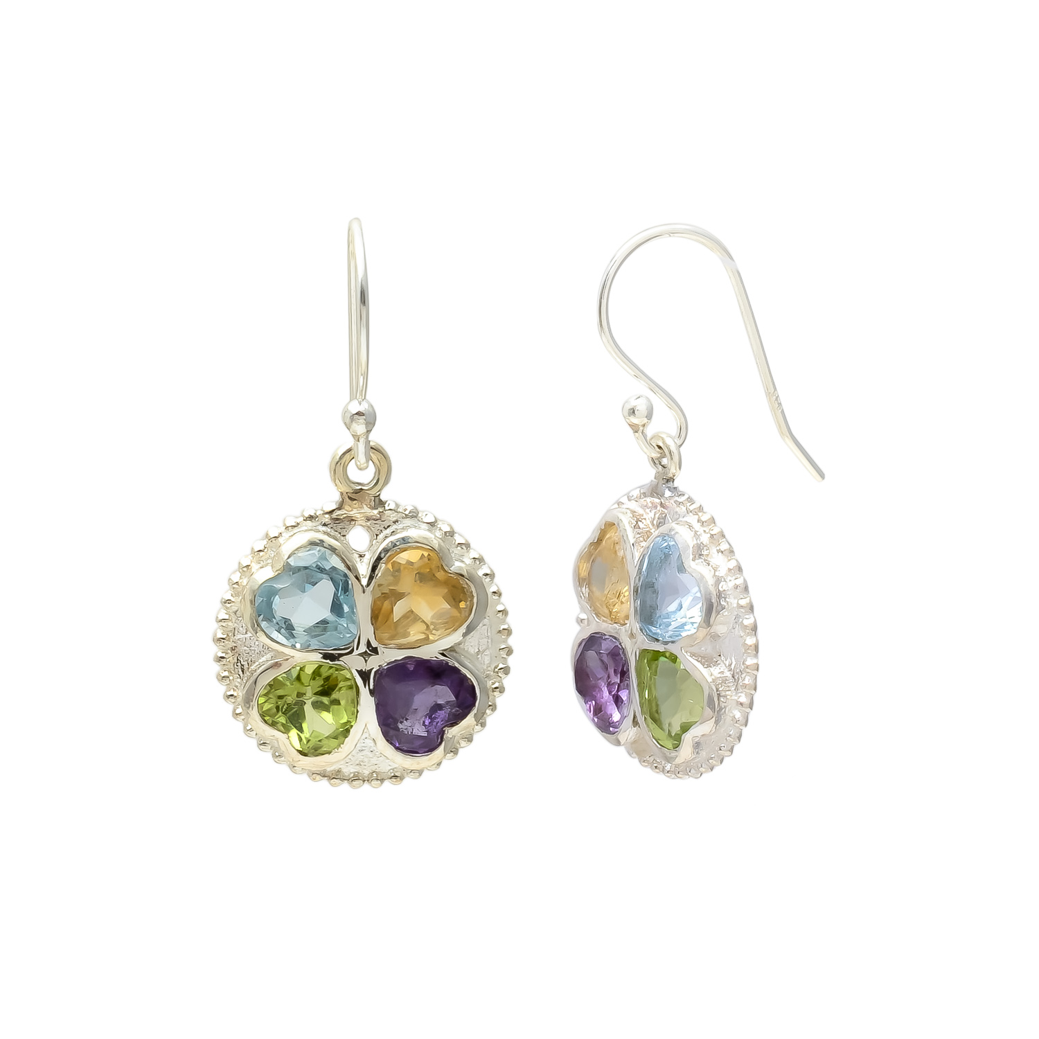 Celebrate love, luck, and elegance with these exquisite sterling silver earrings, adorned with four radiant heart-shaped gemstones — sparkling blue topaz, golden citrine, fresh peridot, and regal amethyst. The intricate clover-inspired design symbolizes beauty and harmony, while the vibrant colors add a touch of timeless charm. A perfect statement of sophistication for any occasion.