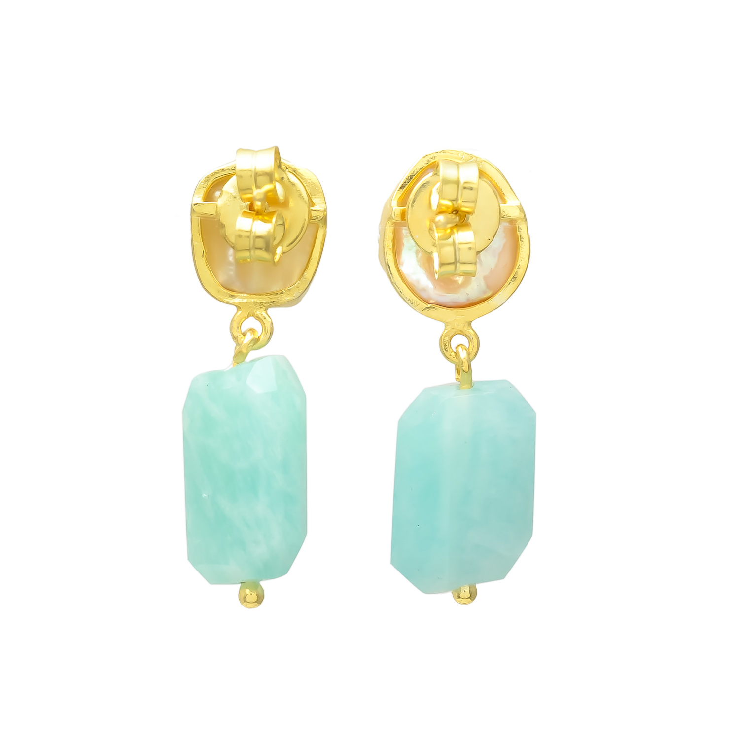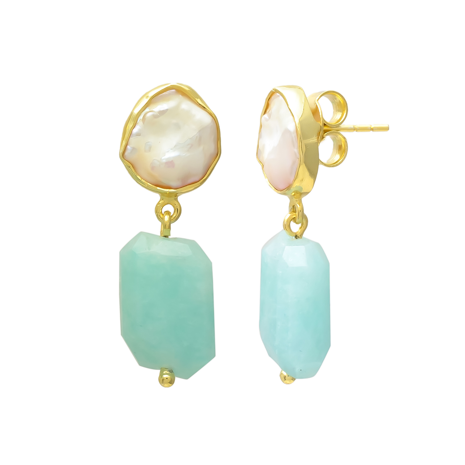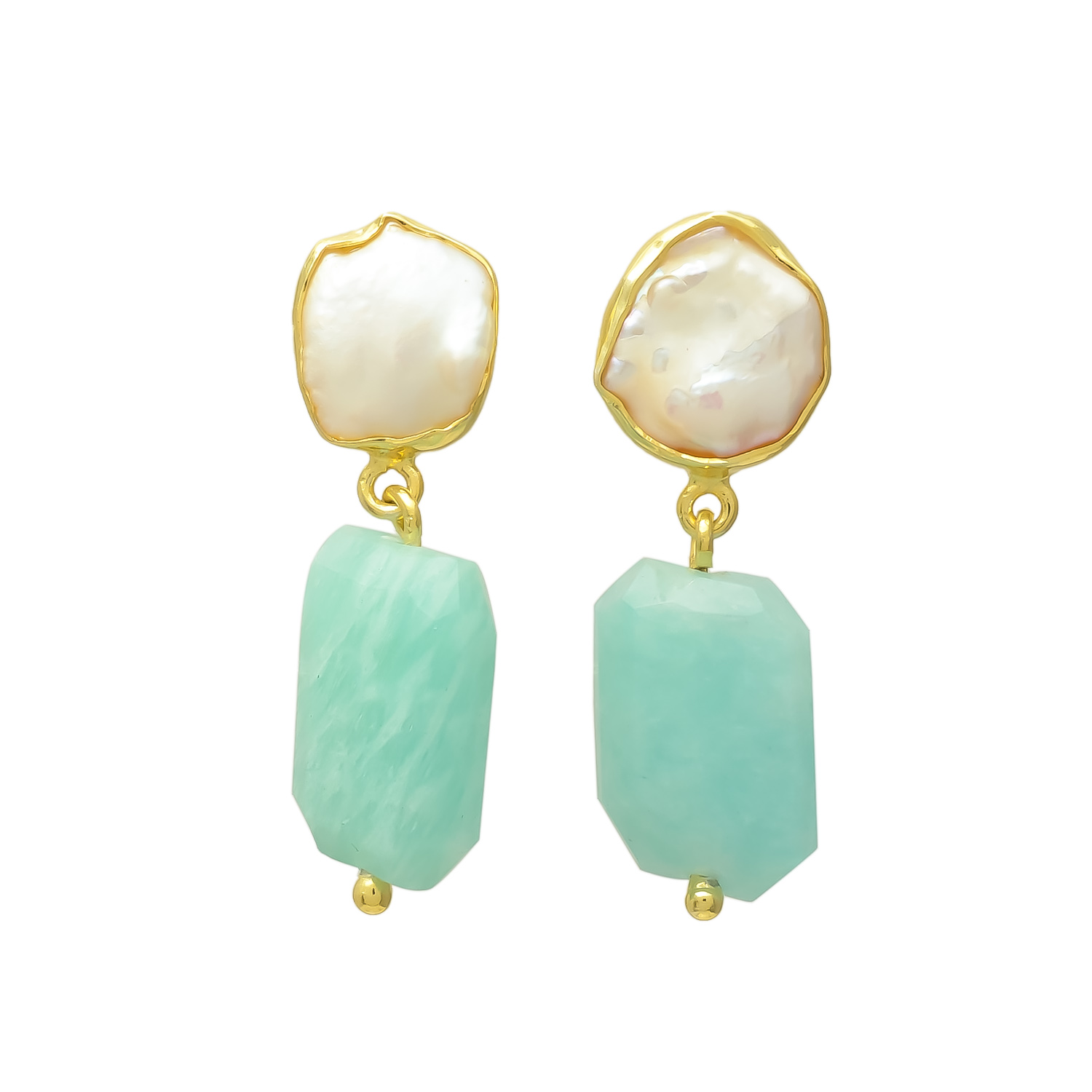 Elevate your style with these elegant gold drop earrings, featuring luminous freshwater pearls paired with soothing green amazonite gemstones. The organic pearl shapes and faceted amazonite create a perfect balance of natural beauty and timeless sophistication, making them ideal for both everyday elegance and special occasions.